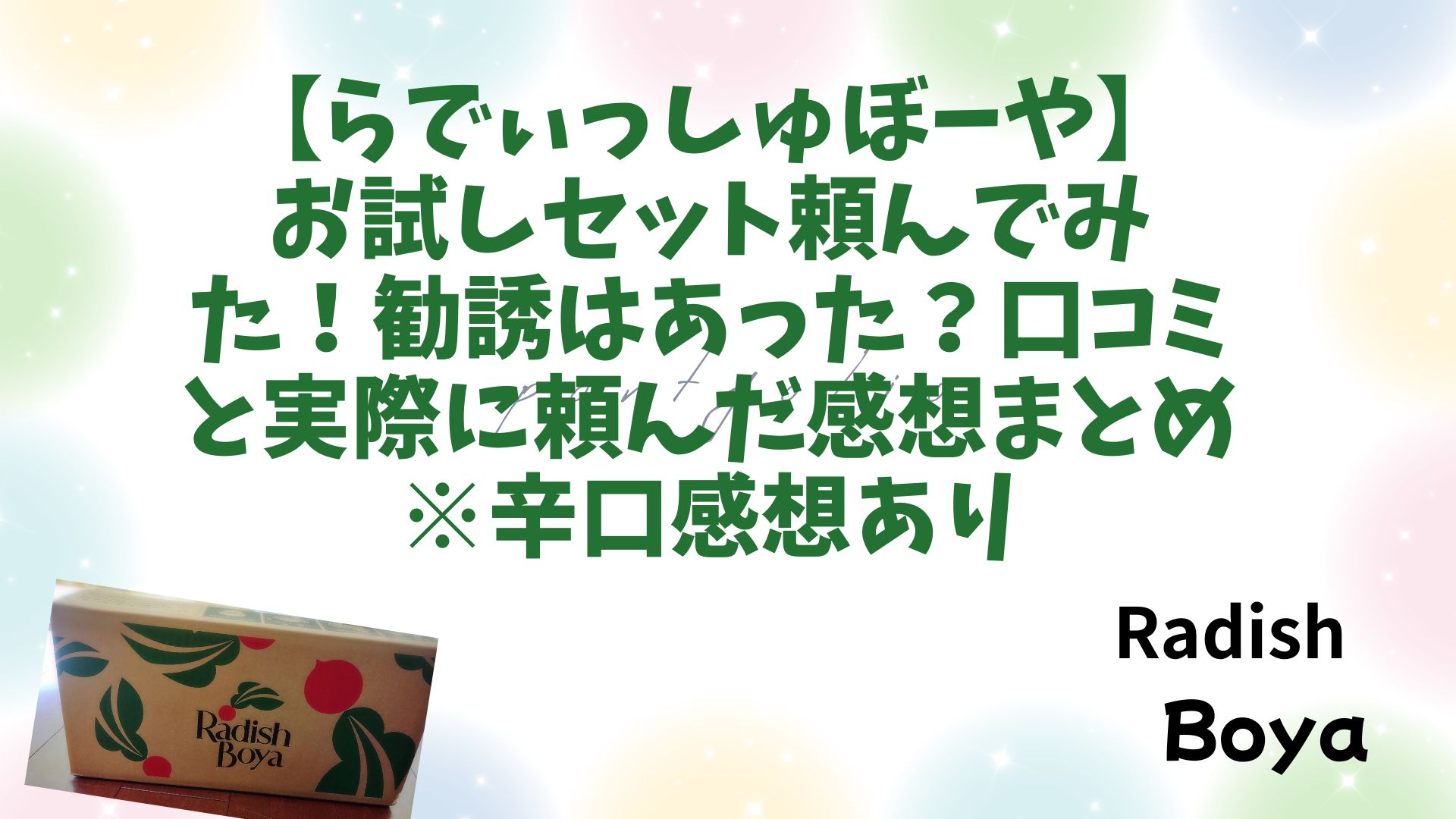 実際に頼んでみた私の体験のもと『【らでぃっしゅぼーや】お試しセット頼んでみた!実際の画像と実食レポ※辛口感想あり』と題して紹介していきます!